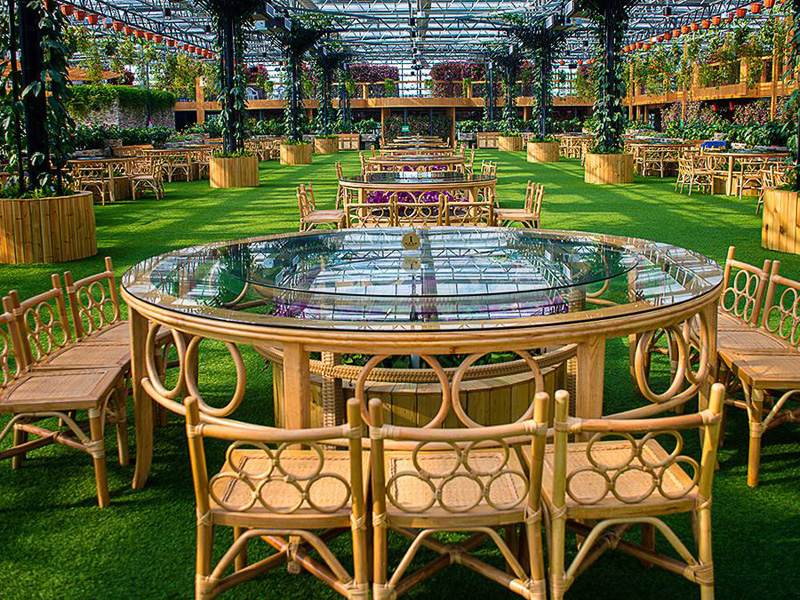 綠色生態餐廳中廳采用大型鋼結構形式,跨度大,高度高、可植入高大樹木,設置亭臺,造景時有更大的發揮空間,使景色更加逼真。中廳周圍設置其他配套連棟溫室,大部分餐飲設置于其中,降低大大的造價和后期維護費用,同時保證了充足的活動空間,美景美食交相輝映,相得益彰。