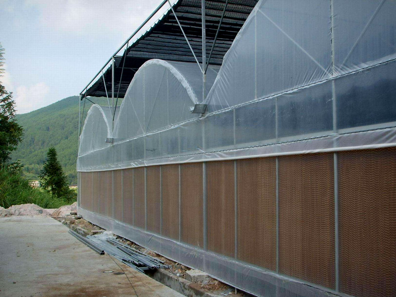 4、采用吸濕性良好的保溫幕材料。透濕和吸濕性良好的保溫幕材料,如無紡布能夠阻止棚內(nèi)表面結(jié)露,并可防止露水落到植株上,從而降低連棟溫室空氣濕度。
